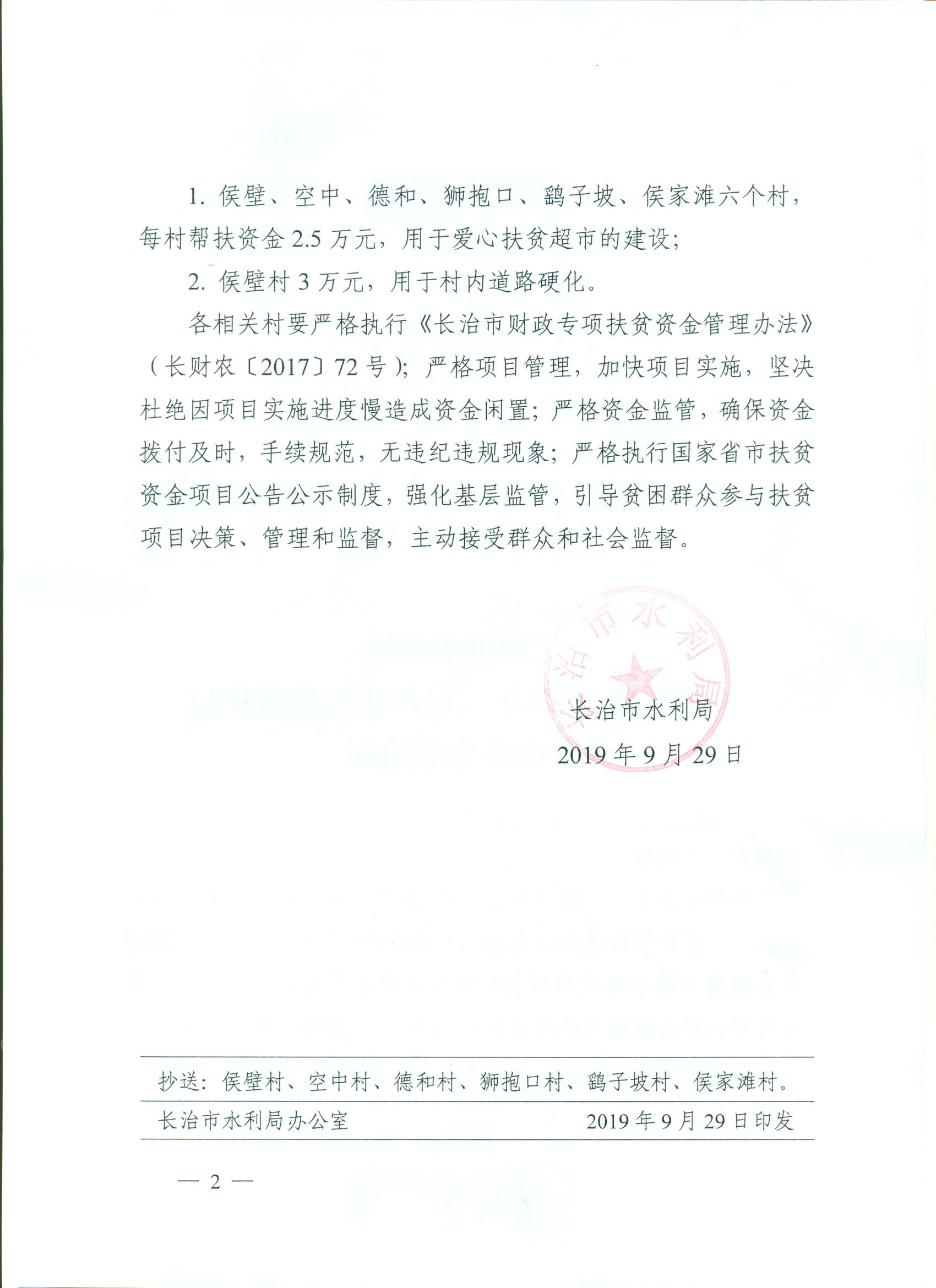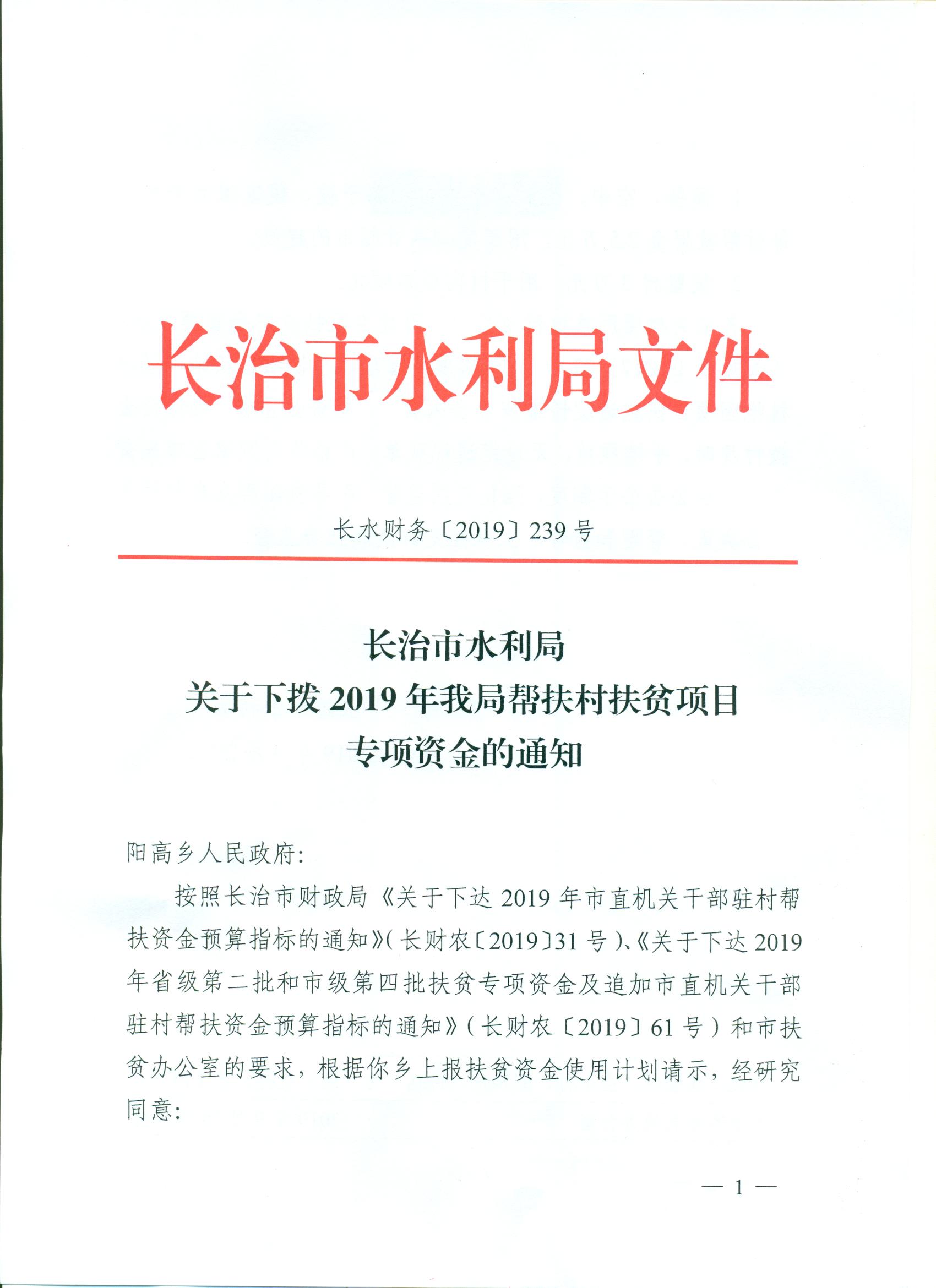 长治市水利局关于下拨2019年我局帮扶村扶贫项目专项资金的通知